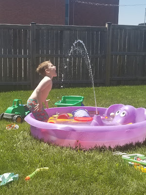 Since Logan got this pool when he wasn't even a year old he has been using the elephant sprayer as a water fountain! And I am glad the tradition continues this year...